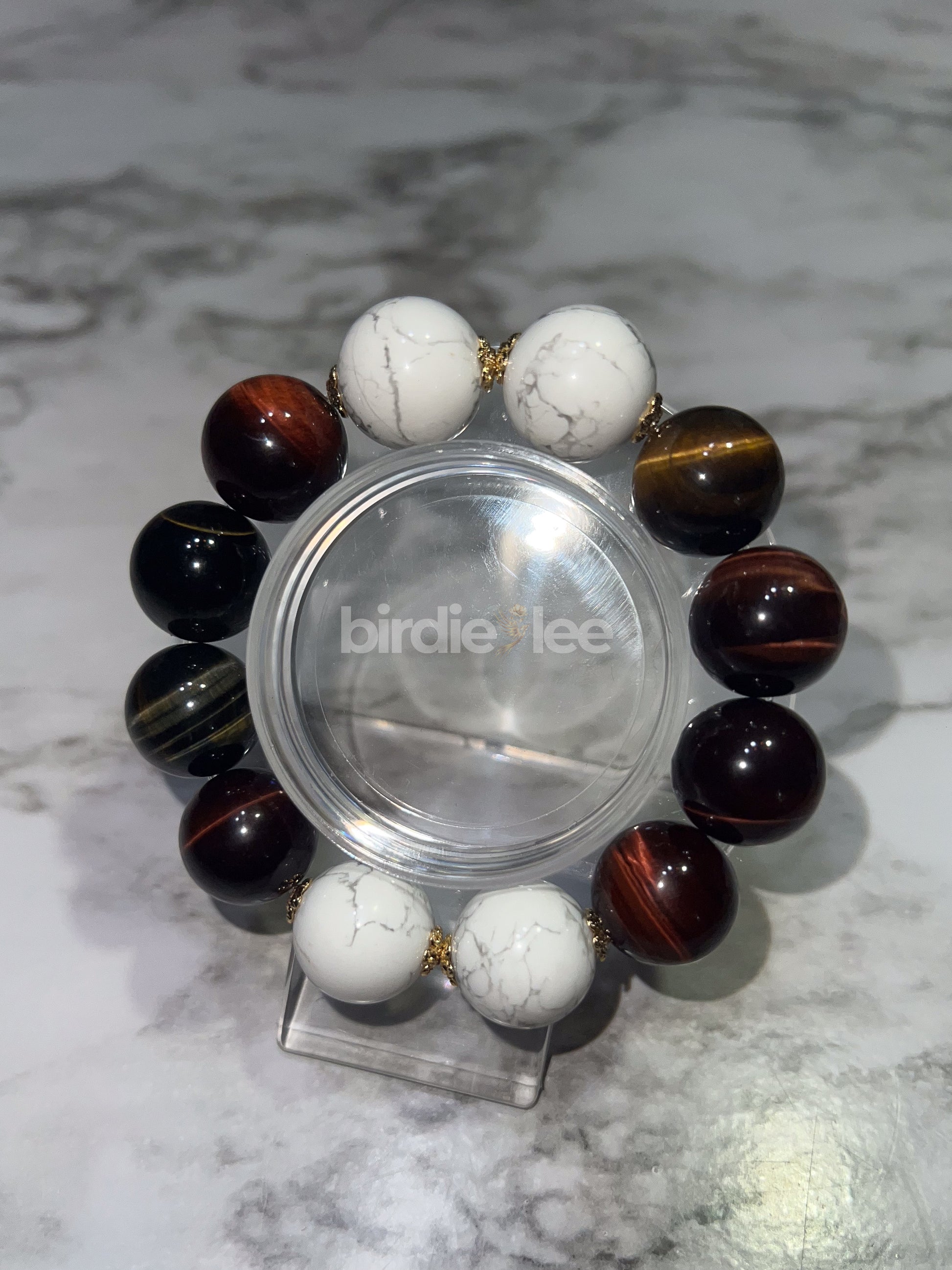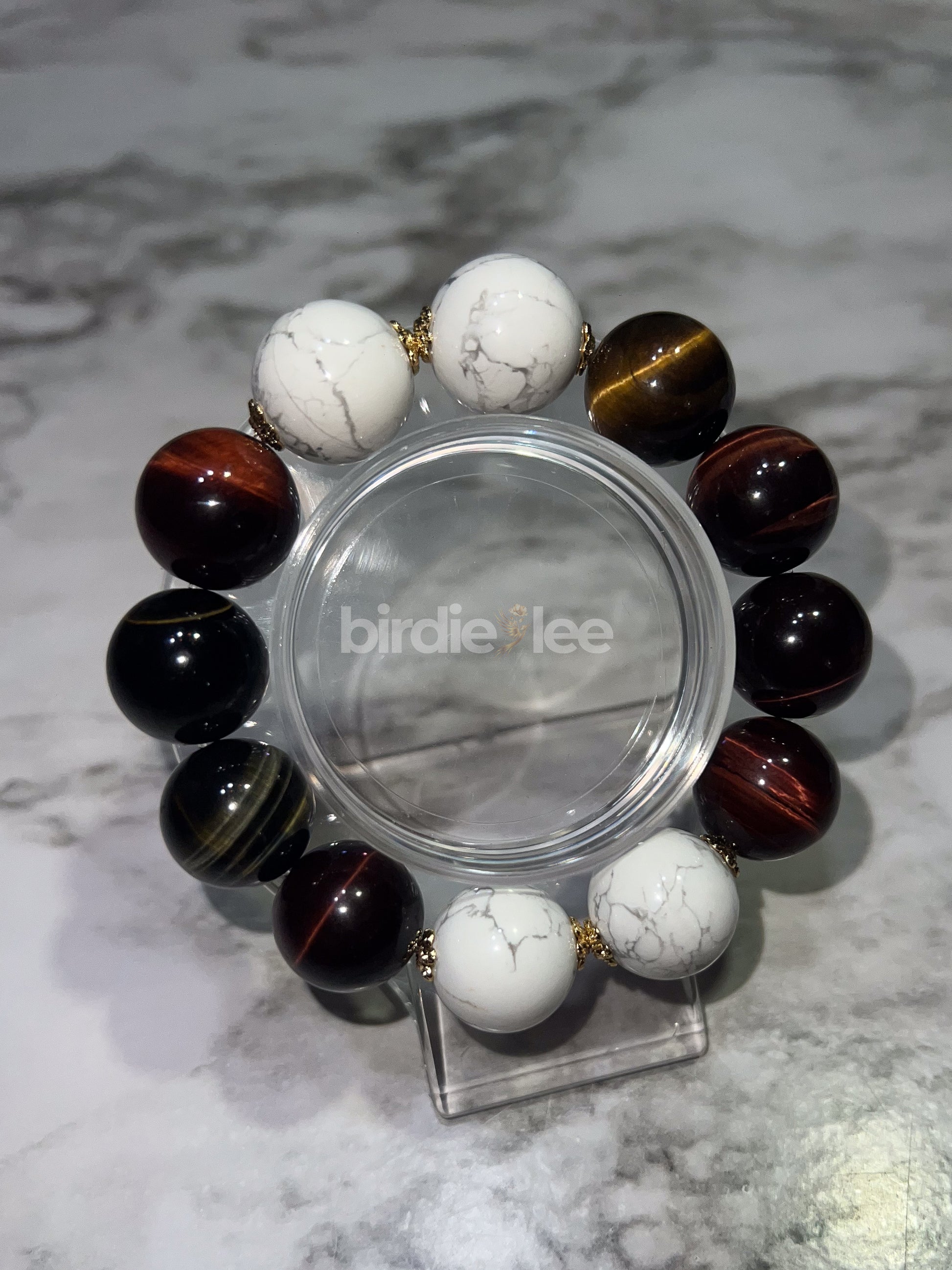 Crafted with 12 bold 16mm beads, this piece combines the calming energy of Howlite with the fierce confidence of Tiger’s Eye, accented by touches of gold for abundance. A striking design that channels focus, strength, and protection while keeping you centered and balanced.