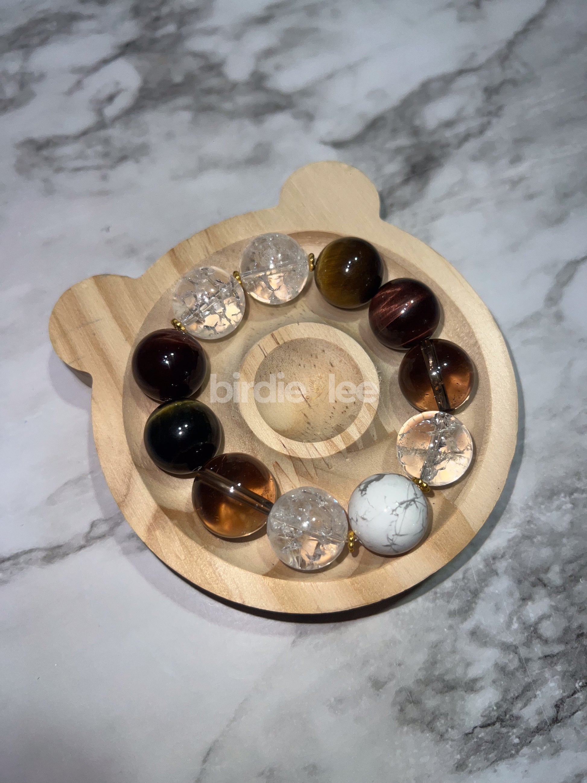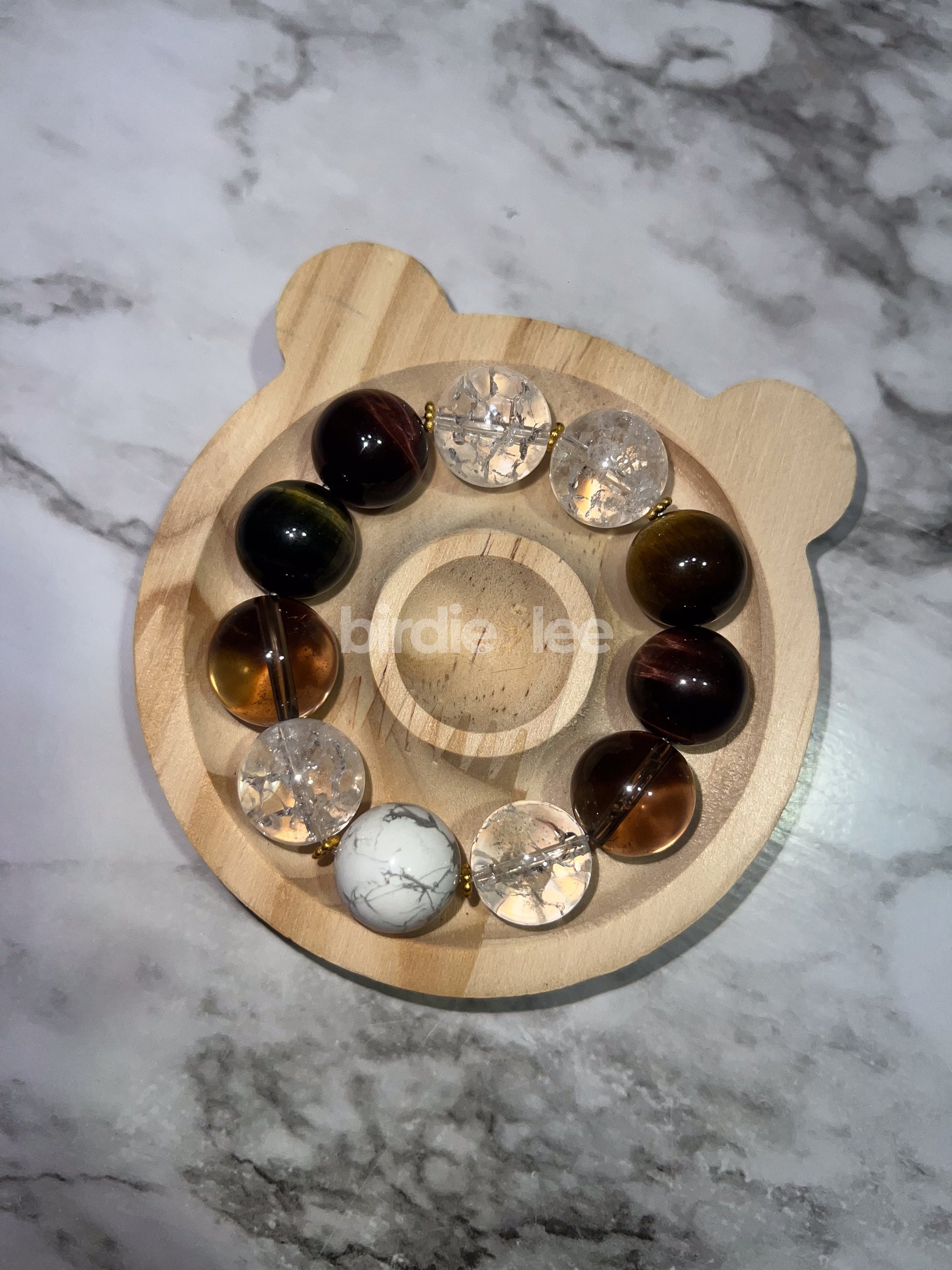 Made with 11 oversized 16mm crystals, this bracelet blends the calming energy of Howlite, the amplified clarity of Crackle Quartz, the grounding protection of Smoky Quartz, and the confident courage of Tiger’s Eye, accented with gold for abundance. A powerful piece designed to balance mind, body, and spirit while keeping you strong and centered.